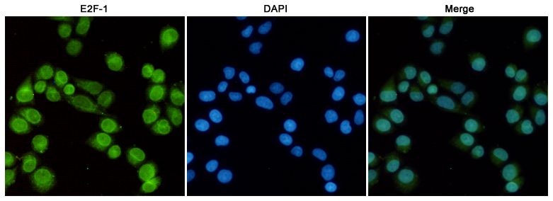 Immunofluorescent analysis of Hela cells fixed with 4% Paraformaldehyde and using anti-E2F-1 mouse mAb (dilution 1:100). DAPI was used to stain nucleus(blue).