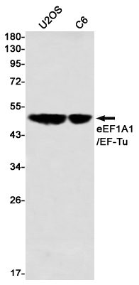 Western blot detection of eEF1A1/EF-Tu in U2OS,C6 using eEF1A1/EF-Tu Rabbit mAb(1:1000 diluted)