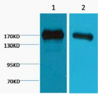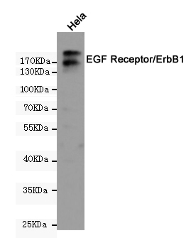 Western blot detection of EGF Receptor/ErbB1 in Hela cell lysates using EGF Receptor/ErbB1 (5E9) Mouse mAb(1:1000 diluted).Predicted band size:170KDa.Observed band size:175KDa.