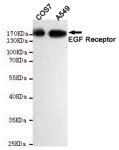 Western blot detection of EGFR in A549 and COS7 cell lysates using EGFR mouse mAb(dilution 1:2000).Predicted band size:134 Kda.Observed band size:175KDa.