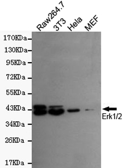 Western blot detection of ERK1/ERK2 in Hela,3T3 and Raw264.7 cell lysates using ERK1/ERK2 mouse mAb (1:300 diluted).Predicted band size:42/44KDa.Observed band size:42/44KDa.