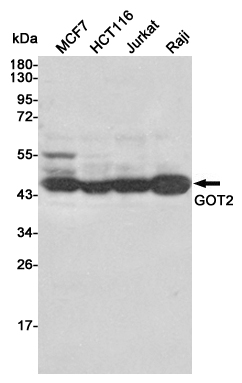 Western blot detection of GOT2 in MCF7,HCT116,Jurkat and Raji cell lysates using GOT2 mouse mAb (1:1000 diluted).Predicted band size:47KDa.Observed band size:47KDa.