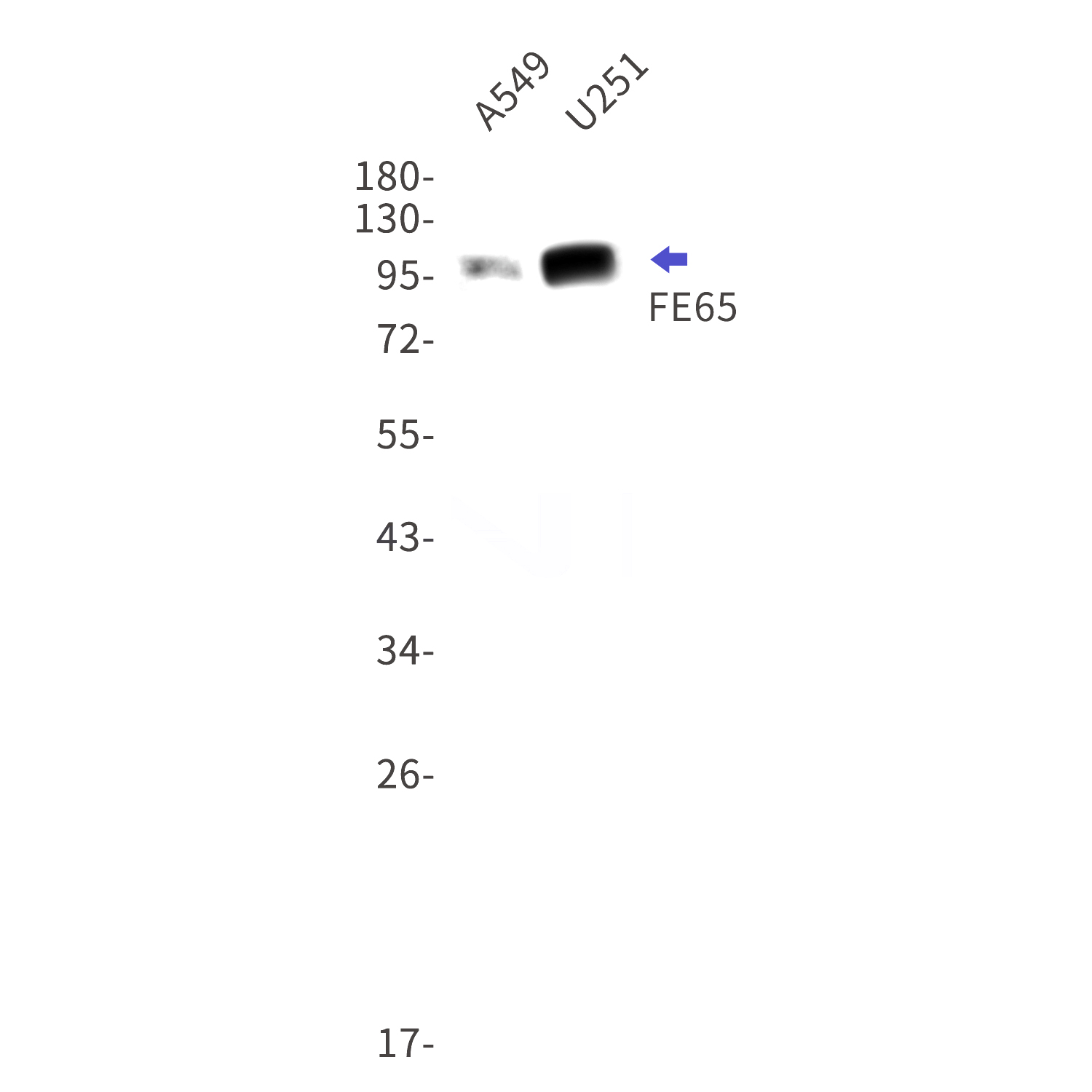Western blot detection of FE65 in A549,U251 cell lysates using FE65 Rabbit mAb(1:1000 diluted).Predicted band size:77kDa.Observed band size:100kDa.