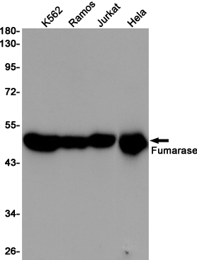 Western blot detection of Fumarase in K562,Ramos,Jurkat,Hela cell lysates using Fumarase (9B1) Mouse mAb(1:1000 diluted).Predicted band size:50KDa.Observed band size:50KDa.
