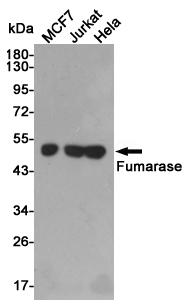 Western blot detection of Fumarase in MCF7,Jurkat and Hela cell lysates using Fumarase mouse mAb (1:3000 diluted).Predicted band size:50kDa.Observed band size:50kDa.