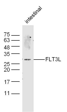 Fig1: Sample: intestine (Mouse) Lysate at 40 ug; Primary: Anti-FLT3L(bs-10196R) at 1/300 dilution; Secondary: IRDye800CW Goat Anti-Rabbit IgG at 1/20000 dilution; Predicted band size: 23 kD; Observed band size: 28 kD
