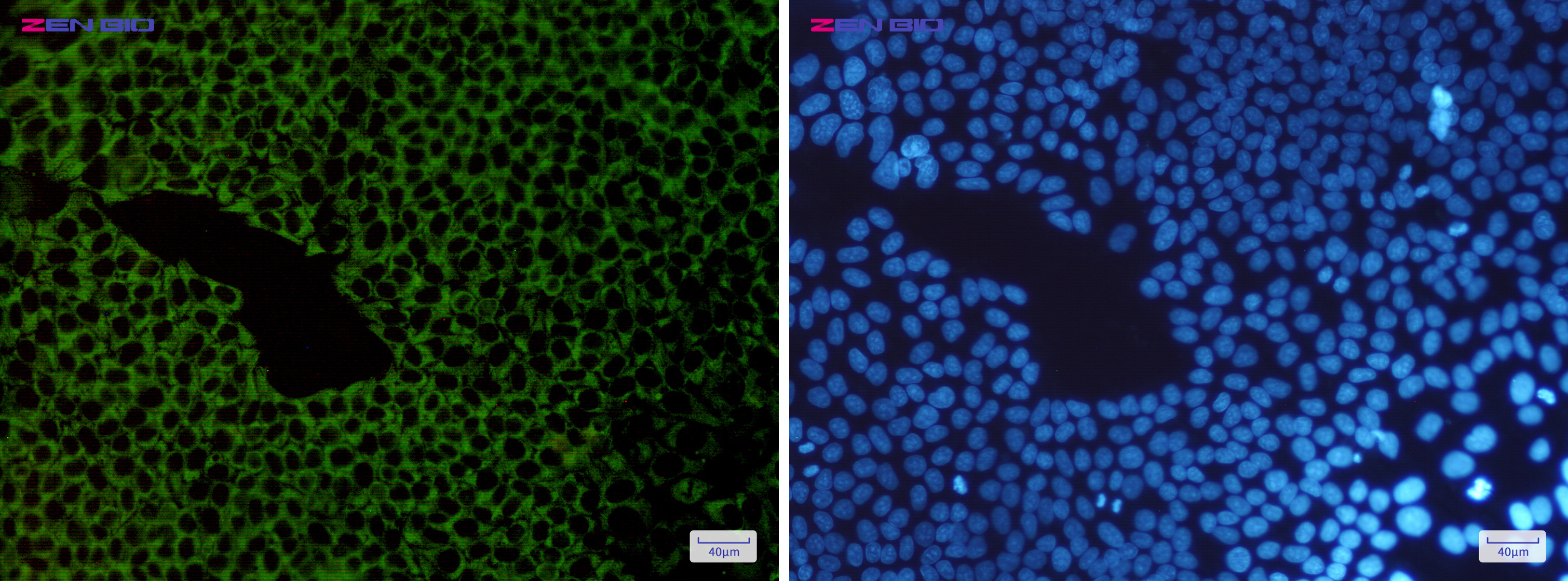 Immunocytochemistry of G3BP(green) in Hela cells using G3BP Rabbit mAb at dilution 1/200, and DAPI(blue)