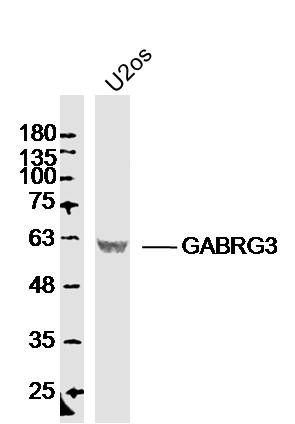 Fig1: Sample:; U2os Cell (Human) Lysate at 30 ug; Primary: Anti- GABRG3 at 1/300 dilution; Secondary: IRDye800CW Goat Anti-Rabbit IgG at 1/20000 dilution; Predicted band size: 52kD; Observed band size: 62kD