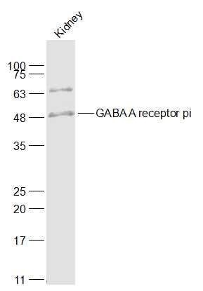 Fig1: Sample:; Kidney(Mouse) Lysate at 40 ug; Primary: Anti-GABA A receptor pi at 1/1000 dilution; Secondary: IRDye800CW Goat Anti-Rabbit IgG at 1/20000 dilution; Predicted band size: 49 kD; Observed band size: 49 kD
