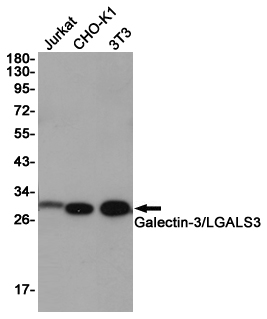 Western blot detection of Galectin-3/LGALS3 in Jurkat,CHO-K1,3T3 cell lysates using Galectin-3/LGALS3 (4B2) Mouse mAb(1:1000 diluted).Predicted band size:26KDa.Observed band size:28KDa.