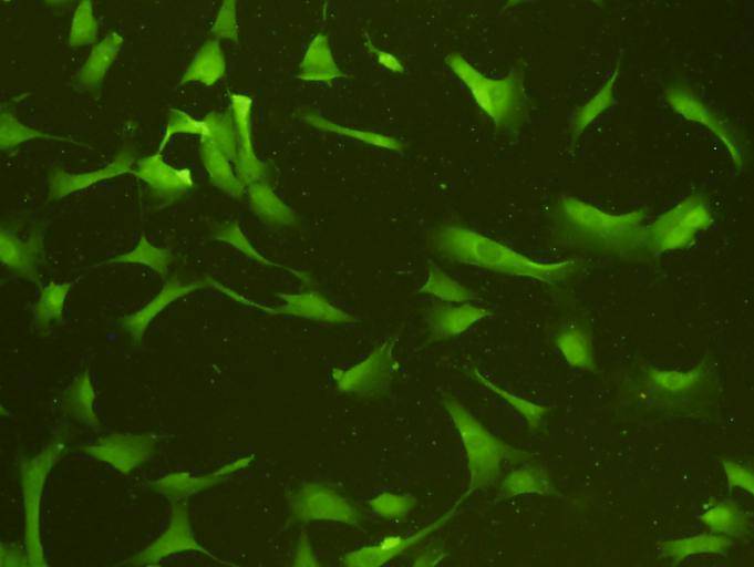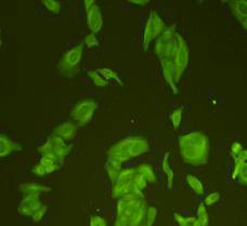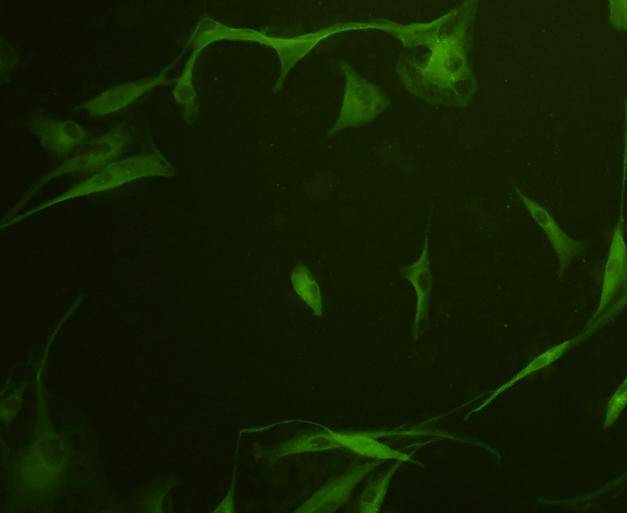 Fig2: ICC staining GAP43 in Hela cells (green). Cells were fixed in paraformaldehyde, permeabilised with 0.25% Triton X100/PBS.