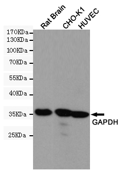 Western blot detection of GAPDH in Rat brain, CHO-K1 and HUVEC cell lysates using GAPDH Mouse mAb (HRP Conjugate) (1:5000 diluted).Predicted band size:36KDa.Observed band size:36KDa.