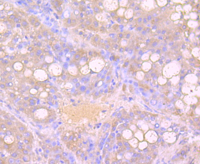 Fig3:; Immunohistochemical analysis of paraffin-embedded human liver carcinoma tissue using anti-Growth Hormone antibody. The section was pre-treated using heat mediated antigen retrieval with Tris-EDTA buffer (pH 9.0) for 20 minutes.The tissues were blocked in 1% BSA for 30 minutes at room temperature, washed with ddH; 2; O and PBS, and then probed with the primary antibody ( 1/50) for 30 minutes at room temperature. The detection was performed using an HRP conjugated compact polymer system. DAB was used as the chromogen. Tissues were counterstained with hematoxylin and mounted with DPX.