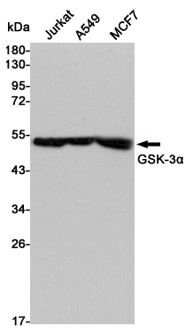 Western blot detection of GSK-3α in Jurkat,A549 and MCF7 cell lysates using GSK-3α mouse mAb (1:1000 diluted).Predicted band size:51KDa.Observed band size:51KDa.