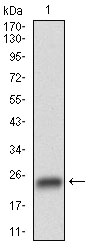 Western blot analysis using GSK3B mAb against human GSK3B (AA: 2-159) recombinant protein. (Expected MW is 20.3 kDa)