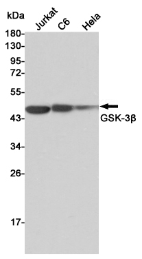 Western blot detection of GSK-3β in Jurkat,C6 and Hela cell lysates using GSK-3β mouse mAb (1:2000 diluted).Predicted band size:46KDa.Observed band size:46KDa.