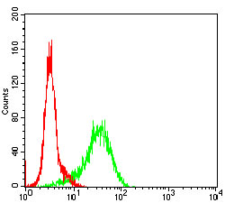 Flow cytometric analysis of NIH/3T3 cells using GSK3B mouse mAb (green) and negative control (red).