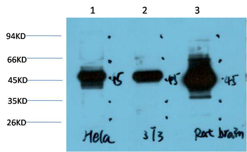 Western blot analysis of 1) Hela Cell Lysate, 2) 3T3 Cell Lysate, 3) Rat Brain Tissue Lysate using GSK3β Mouse mAb diluted at 1:1000.