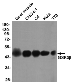 Western blot detection of GSK3β in Goat muscle,CHO-K1,C6,Hela,3T3 cell lysates using GSK3β (9F9) Mouse mAb(1:1000 diluted).Predicted band size:46KDa.Observed band size:46KDa.