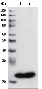 Western blot analysis using GSTP1 mouse mAb against HEK293T cells transfected with the pCMV6-ENTRY control (1) and pCMV6-ENTRY GSTP1 cDNA (2).