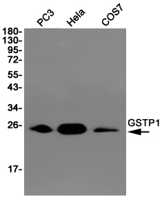 Western blot detection of GSTP1 in PC3,Hela,COS7 cell lysates using GSTP1 (9D4) Mouse mAb(1:1000 diluted).Predicted band size:23KDa.Observed band size:23KDa.