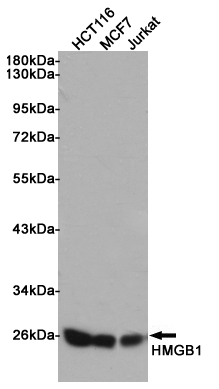 Western blot analysis of extracts from HCT116, MCF7 and Jurkat cells using HMGB1 Rabbit pAb at 1:1000 dilution. Predicted band size: 25kDa. Observed band size: 25kDa.
