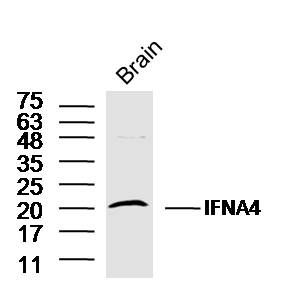 Fig1: Tissue/cell: mouse brain tissue; 4% Paraformaldehyde-fixed and paraffin-embedded;; Antigen retrieval: citrate buffer ( 0.01M, pH 6.0 ), Boiling bathing for 15min; Block endogenous peroxidase by 3% Hydrogen peroxide for 30min; Blocking buffer (normal goat serum,C-0005) at 37℃ for 20 min;; Incubation: Anti-IFNA4 Polyclonal Antibody, Unconjugated 1:500, overnight at 4℃, followed by conjugation to the secondary antibody(SP-0023) and DAB(C-0010) staining