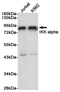Western blot analysis of extracts from Jurkat and K562 cells using IKKα Rabbit pAb at 1:1000 dilution. Predicted band size: 85kDa. Observed band size: 85kDa.