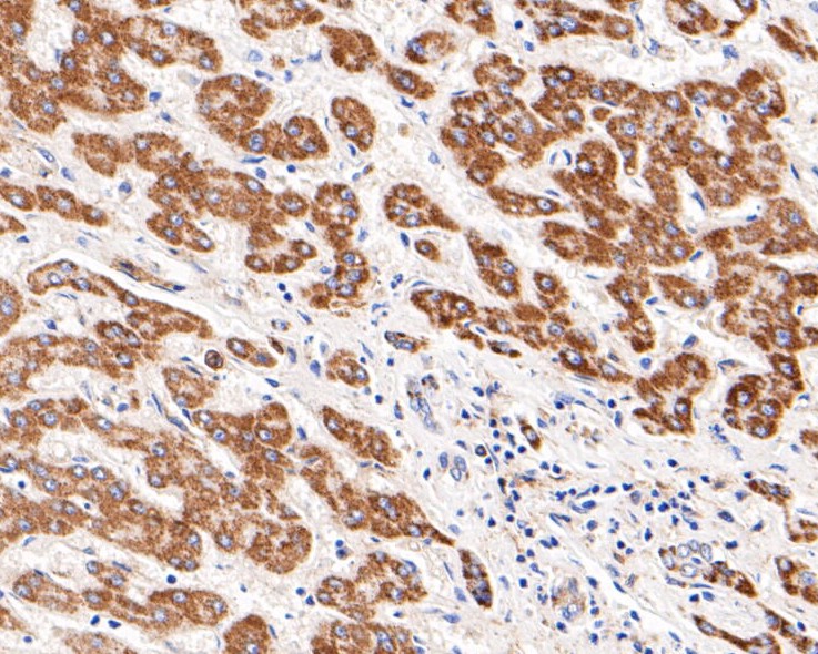 Fig2: Immunohistochemical analysis of paraffin-embedded human liver tissue using anti-Kir5.1 antibody. The section was pre-treated using heat mediated antigen retrieval with Tris-EDTA buffer (pH 8.0-8.4) for 20 minutes.The tissues were blocked in 5% BSA for 30 minutes at room temperature, washed with ddH2O and PBS, and then probed with the primary antibody ( 1/200) for 30 minutes at room temperature. The detection was performed using an HRP conjugated compact polymer system. DAB was used as the chromogen. Tissues were counterstained with hematoxylin and mounted with DPX.