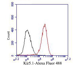Fig4: Flow cytometric analysis of Kir5.1 was done on 293 cells. The cells were fixed, permeabilized and stained with the primary antibody ( 1/50) (red). After incubation of the primary antibody at room temperature for an hour, the cells were stained with a Alexa Fluor 488-conjugated Goat anti-Rabbit IgG Secondary antibody at 1/1000 dilution for 30 minutes.Unlabelled sample was used as a control (cells without incubation with primary antibody; black).