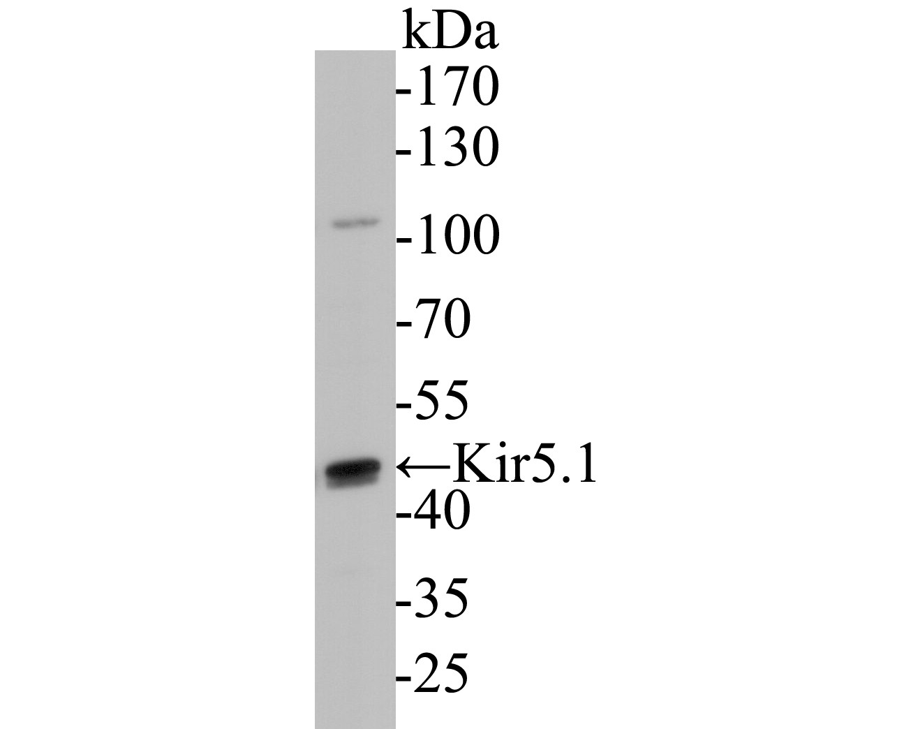 Fig1: Western blot analysis of Kir5.1 on mouse kidney tissue lysate. Proteins were transferred to a PVDF membrane and blocked with 5% BSA in PBS for 1 hour at room temperature. The primary antibody ( 1/2000) was used in 5% BSA at room temperature for 2 hours. Goat Anti-Rabbit IgG - HRP Secondary Antibody (HA1001) at 1:5,000 dilution was used for 1 hour at room temperature.