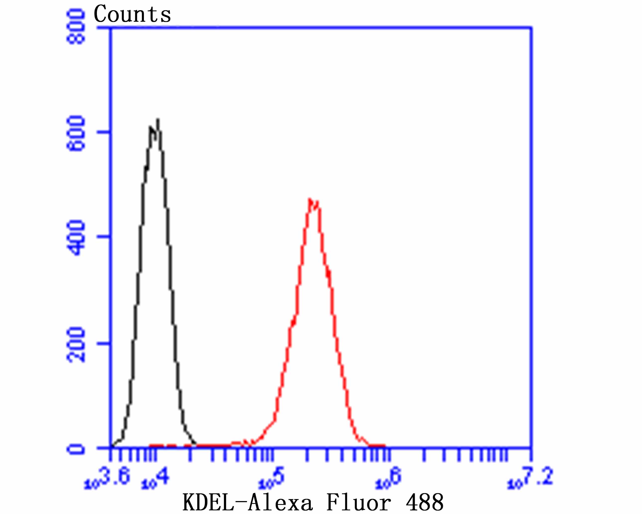 Fig10:; Flow cytometric analysis of KDEL was done on HepG2 cells. The cells were fixed, permeabilized and stained with the primary antibody ( 1/50) (red). After incubation of the primary antibody at room temperature for an hour, the cells were stained with a Alexa Fluor 488-conjugated Goat anti-Rabbit IgG Secondary antibody at 1/1000 dilution for 30 minutes.Unlabelled sample was used as a control (cells without incubation with primary antibody; black).