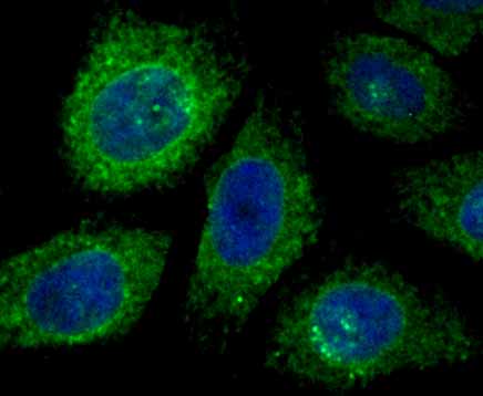 Fig3:; ICC staining of KDEL in HepG2 cells (green). Formalin fixed cells were permeabilized with 0.1% Triton X-100 in TBS for 10 minutes at room temperature and blocked with 1% Blocker BSA for 15 minutes at room temperature. Cells were probed with the primary antibody ( 1/500) for 1 hour at room temperature, washed with PBS. Alexa Fluor®488 Goat anti-Rabbit IgG was used as the secondary antibody at 1/1,000 dilution. The nuclear counter stain is DAPI (blue).