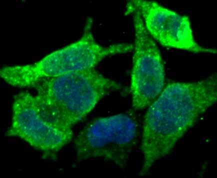Fig4:; ICC staining of KDEL in 293T cells (green). Formalin fixed cells were permeabilized with 0.1% Triton X-100 in TBS for 10 minutes at room temperature and blocked with 1% Blocker BSA for 15 minutes at room temperature. Cells were probed with the primary antibody ( 1/500) for 1 hour at room temperature, washed with PBS. Alexa Fluor®488 Goat anti-Rabbit IgG was used as the secondary antibody at 1/1,000 dilution. The nuclear counter stain is DAPI (blue).