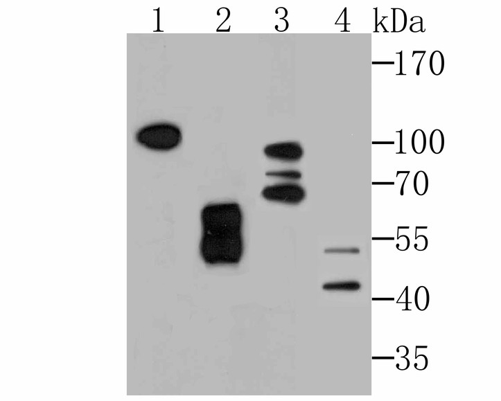 Fig1:; Western blot analysis of KDEL on different lysates. Proteins were transferred to a PVDF membrane and blocked with 5% BSA in PBS for 1 hour at room temperature. The primary antibody ( 1/500) was used in 5% BSA at room temperature for 2 hours. Goat Anti-Rabbit IgG - HRP Secondary Antibody (HA1001) at 1:40,000 dilution was used for 1 hour at room temperature.; Positive control:; Lane 1: Rat testis tissue lysate; Lane 2: Human placenta tissue lysate; Lane 3: Mouse testis tissue lysate; Lane 4: 293 cell lysate