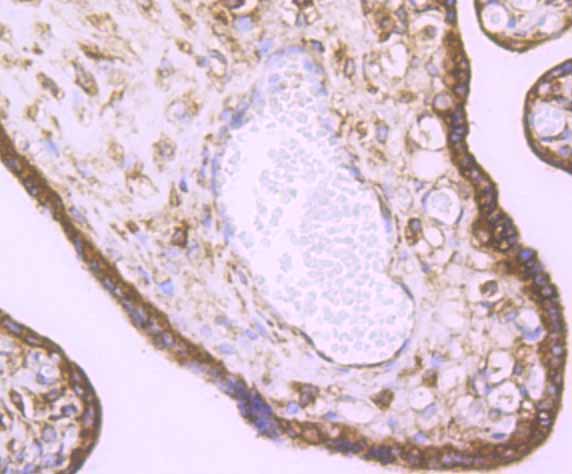 Fig5:; Immunohistochemical analysis of paraffin-embedded human placenta tissue using anti-KDEL antibody. The section was pre-treated using heat mediated antigen retrieval with Tris-EDTA buffer (pH 8.0-8.4) for 20 minutes.The tissues were blocked in 5% BSA for 30 minutes at room temperature, washed with ddH; 2; O and PBS, and then probed with the primary antibody ( 1/100) for 30 minutes at room temperature. The detection was performed using an HRP conjugated compact polymer system. DAB was used as the chromogen. Tissues were counterstained with hematoxylin and mounted with DPX.