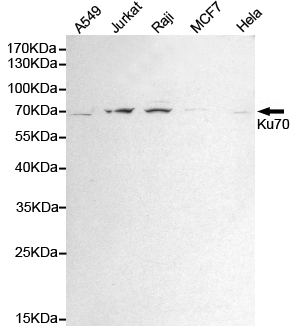 Western blot detection of Ku70 in Hela,A549,MCF7,Jurkat and Raji cell lysates using Ku70 mouse mAb (1:1000 diluted).Predicted band size:70KDa.Observed band size:70KDa.