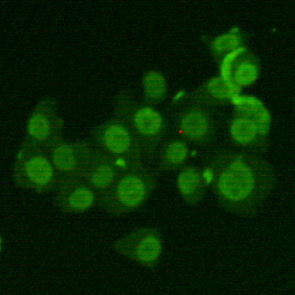 Immunocytochemistry staining of HeLa cells fixed with 4% Paraformaldehyde and using Ku70 mouse mAb (dilution 1:200).