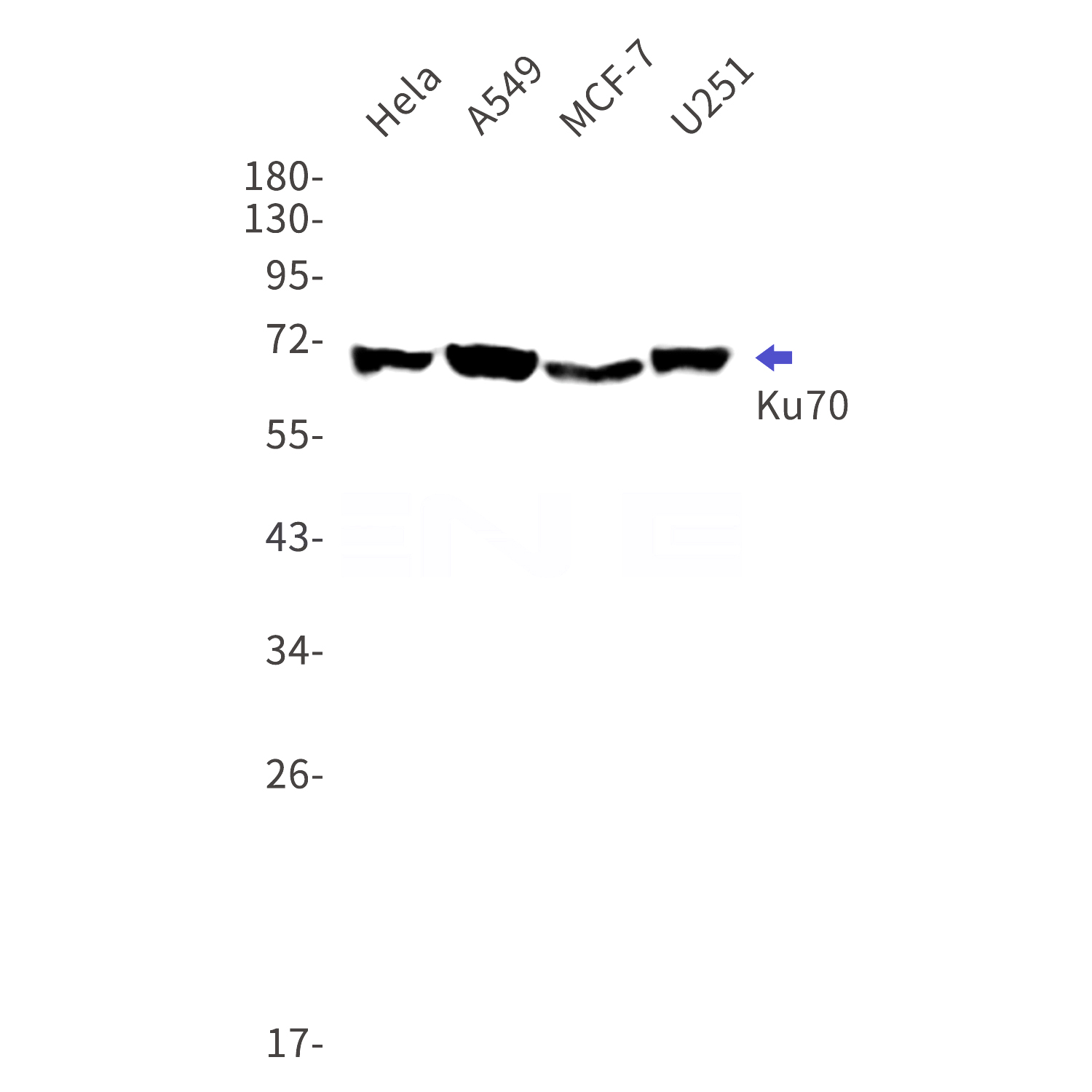 Western blot detection of Ku70 in Hela,A549,MCF-7,U251cell lysates using Ku70 Rabbit mAb(1:1000 diluted).Predicted band size:70kDa.Observed band size:70kDa.