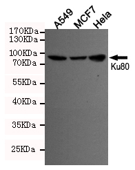 Western blot detection of Ku80 in A549,MCF7 and Hela cell lysates using Ku80 mouse mAb (dilution 1:500).Predicted band size:86KDa.Observed band size:86KDa.