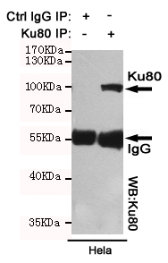 Immunoprecipitation analysis of Hela cell lysates using Ku80 mouse mAb.