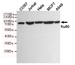 Western blot detection of Ku80 in COS7,Jurkat,Hela,MCF7 and A549 cell lysates using Ku80 mouse mAb (1:1000 diluted). Predicted band size:86KDa. Observed band size:86KDa.