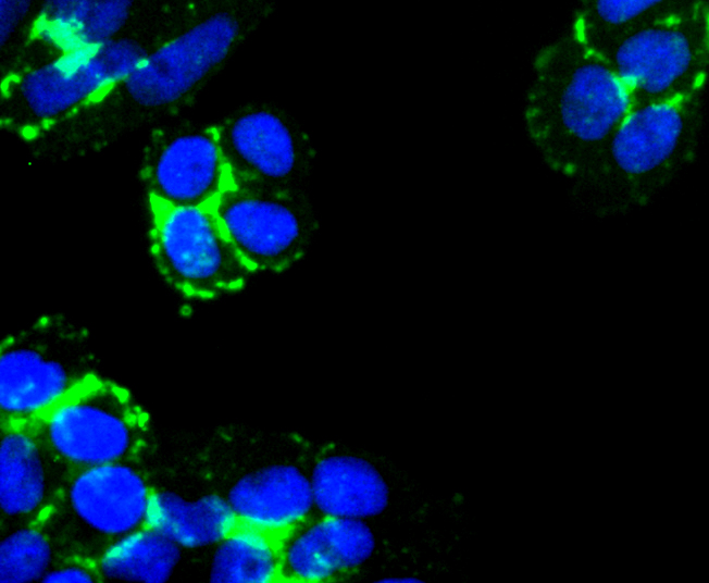 Fig3:; ICC staining of Laminnin 5 alpha 3 in HepG2 cells (green). Formalin fixed cells were permeabilized with 0.1% Triton X-100 in TBS for 10 minutes at room temperature and blocked with 1% Blocker BSA for 15 minutes at room temperature. Cells were probed with the primary antibody ( 1/50) for 1 hour at room temperature, washed with PBS. Alexa Fluor®488 Goat anti-Rabbit IgG was used as the secondary antibody at 1/1,000 dilution. The nuclear counter stain is DAPI (blue).