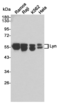 Western blot detection of Lyn in Ramos,Raji,K562 and Hela cell lysates using Lyn mouse mAb(dilution 1:1000).Predicted band size:56/53kDa.Observed band size:56/53kDa.