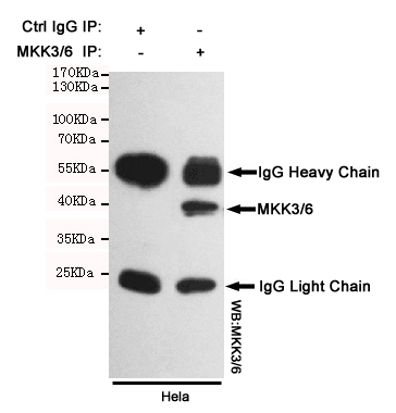 Immunoprecipitation analysis of Hela cell lysates using MKK3/6 mouse mAb.