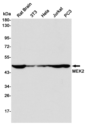 Western blot detection of MEK2 in Rat Brain,3T3,Hela,Jurkat and PC3 cell lysates using MEK2 mouse mAb (1:1000 diluted).Predicted band size:44KDa.Observed band size:45KDa.