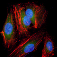 Immunofluorescence analysis of Hela cells using anti-MAP2K2 mAb (green). Red: Actin filaments have been labeled with DY-554 phalloidin. Blue: DRAQ5 fluorescent DNA dye.