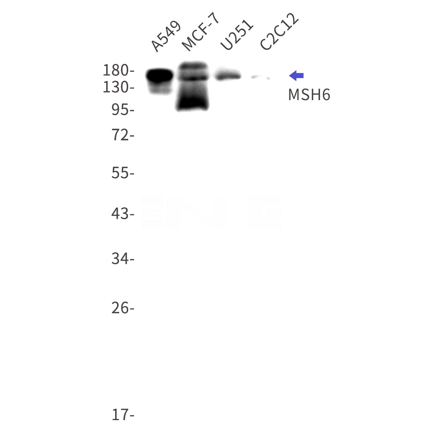 Western blot detection of MSH6 in A549,MCF-7,U251,C2C12 cell lysates using MSH6 Rabbit mAb(1:1000 diluted).Predicted band size:163kDa.Observed band size:163kDa.