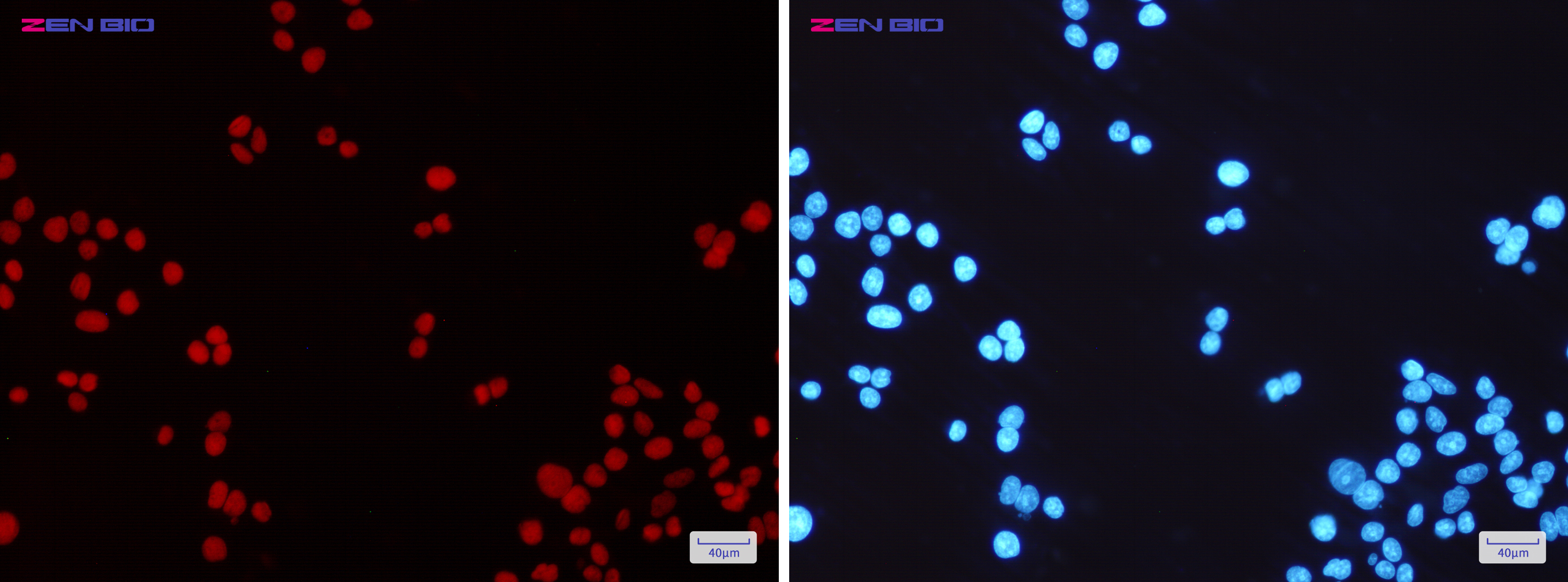 Immunocytochemistry of MSH6(green) in Hela cells using MSH6 Rabbit mAb at dilution 1/200, and DAPI(blue)