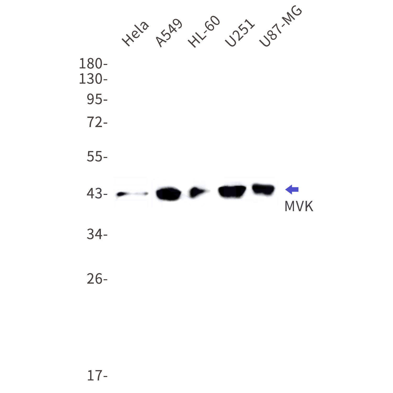 Western blot detection of MVK in Hela,A549,HL-60,U251,U87-MG cell lysates using MVK Rabbit mAb(1:1000 diluted).Predicted band size:43kDa.Observed band size:43kDa.